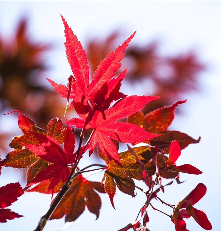 Zudem trägt der Rote Fächerahorn 'Beni Maiko', geschnittene, rosarote Blätter. An einem sonnigen bis halbschattigen, windgeschützten Standort mit durchlässigem, humosem Boden erreicht er gewöhnlich eine Höhe von ca. 2 m und wird ca. 2 m breit.