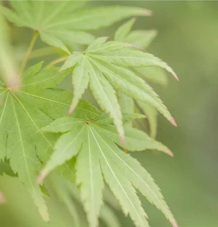 Hoher Blattschmuckwert. Die sommergrünen Blätter des Fächerahorns 'Orange Dream' sind grün, gegenständig, gelappt und weisen einen hellorangenen Rand auf. Diese sind etwa 8 - 10 cm groß. Orangefarbener, früher Austrieb. Fächerahorn 'Orange Dream' zeigt sich leuchtend goldgelb im Herbst.