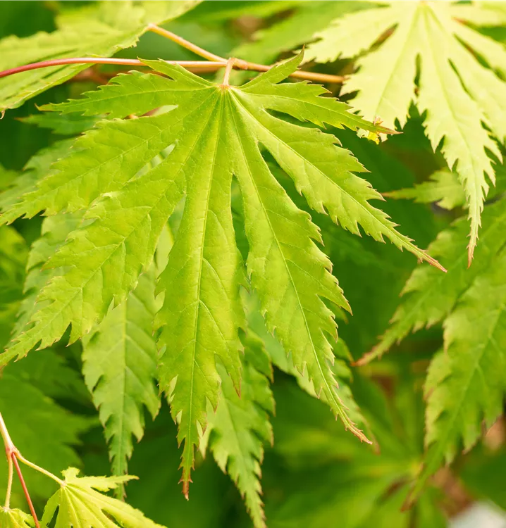 Die sommergrünen Blätter des Koreanischen Fächerahorns 'Arctic Jade'® sind mittelgrün, tief geschlitzt. Koreanischer Fächerahorn 'Arctic Jade'® zeigt sich leuchtend orange-rot im Herbst.