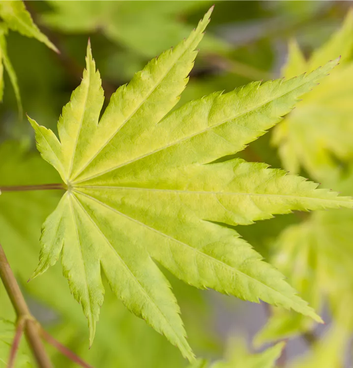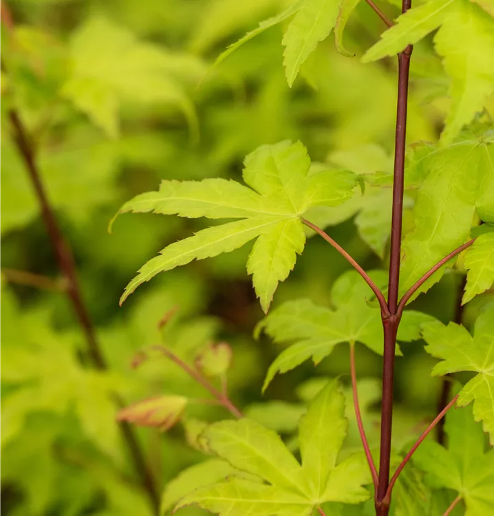 Die sommergrünen Blätter des Fächerahorns 'Jordan'(s) sind gelb-grün, gelappt. Gelber Austrieb. Fächerahorn 'Jordan'(s) zeigt sich leuchtend gelb im Herbst.