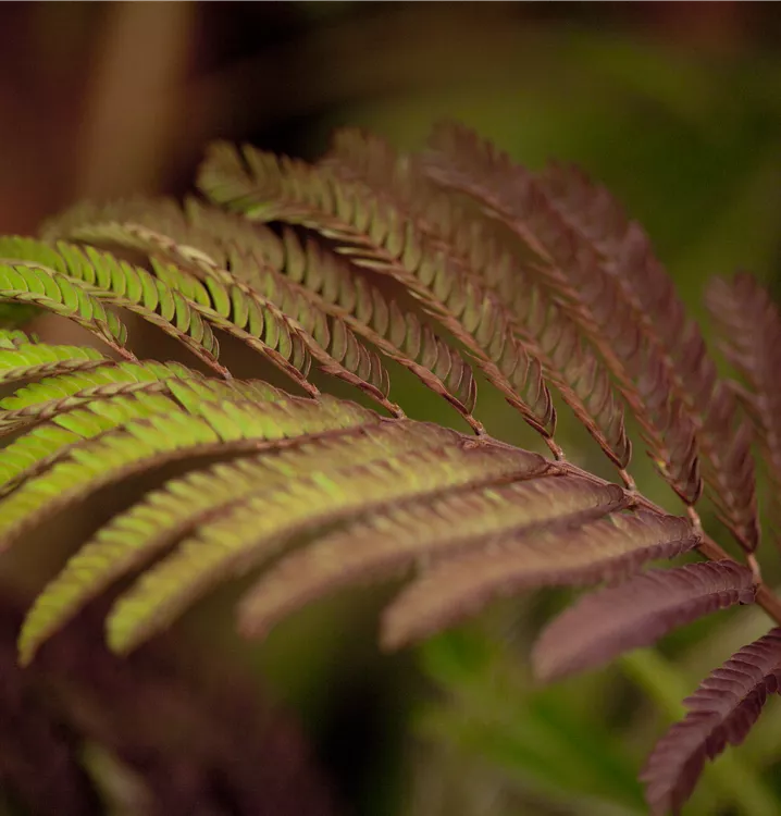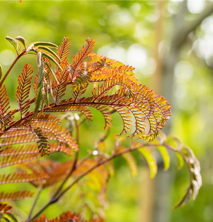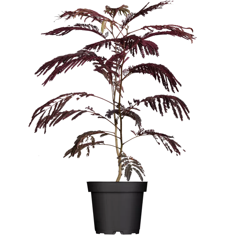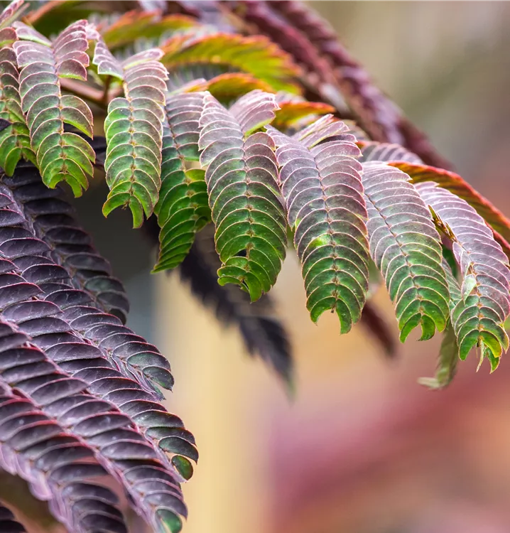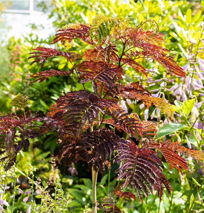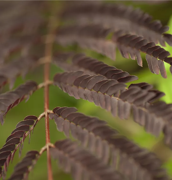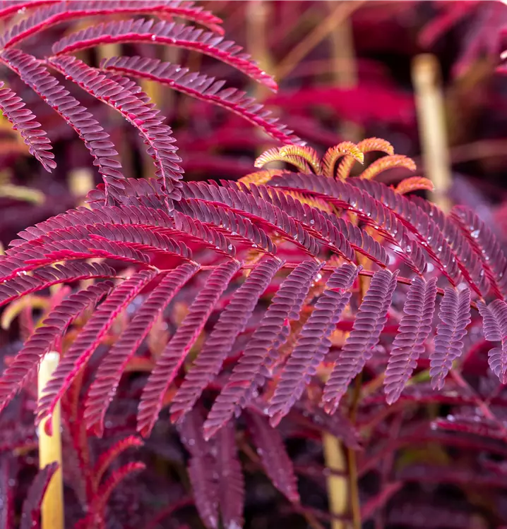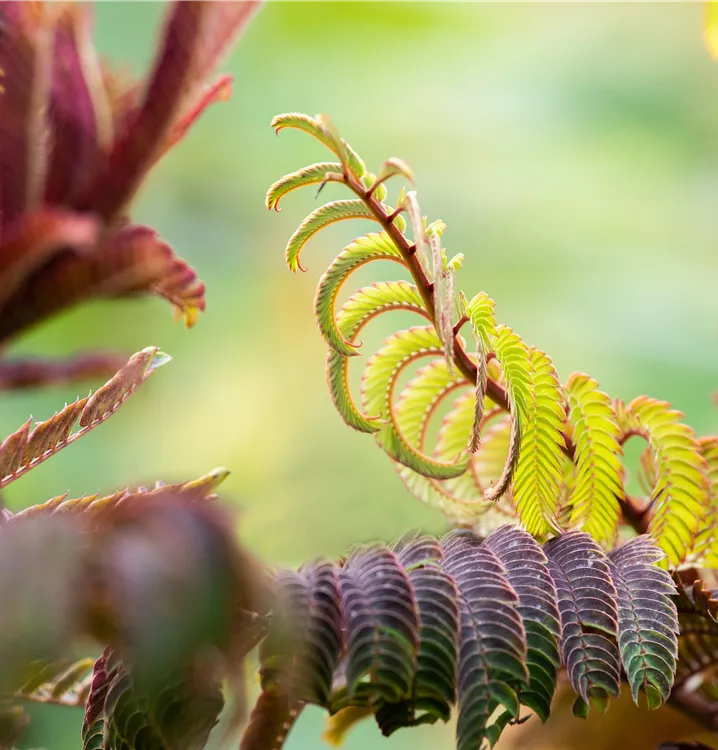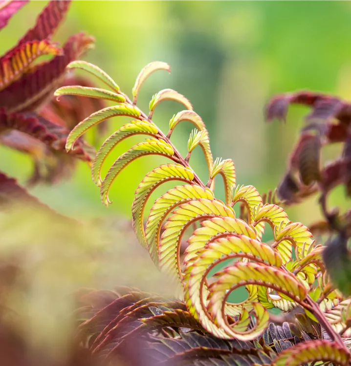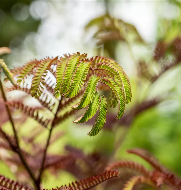 Der Rote Seidenbaum 'Summer Chocolate'(s) (Albizia julibrissin) ist ein rundlicher, aufrechter, sommergrüner Strauch mit dekorativen, gefiederten, rot-braunen Blättern. Zudem trägt er von Juli bis August rosafarbene Blüten. An einem sonnigen bis halbschattigen Standort mit durchlässigem, trockenem Boden erreicht er gewöhnlich eine Höhe von ca. 4 m und wird ca. 3 m breit.