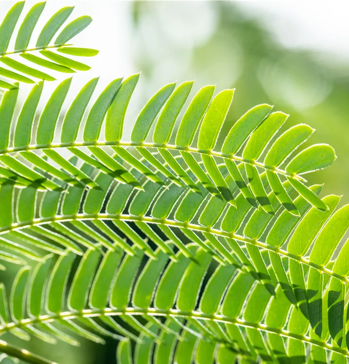 Die sommergrünen Blätter des Seidenbaums sind mittelgrün, gefiedert. Seidenbaum zeigt sich leuchtend gelb-grün im Herbst.