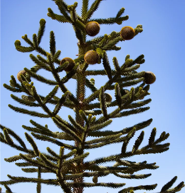 Sehr dekorativ. Die Andentanne ist immergrün. Ihre Nadeln sind dunkelgrün, glänzend, ledrig, dreieckig.