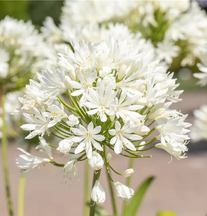 Agapanthus africanus 'Arctic Star' bildet sternförmige, in Ähren angeordnete, weiße Blüten ab Juni.