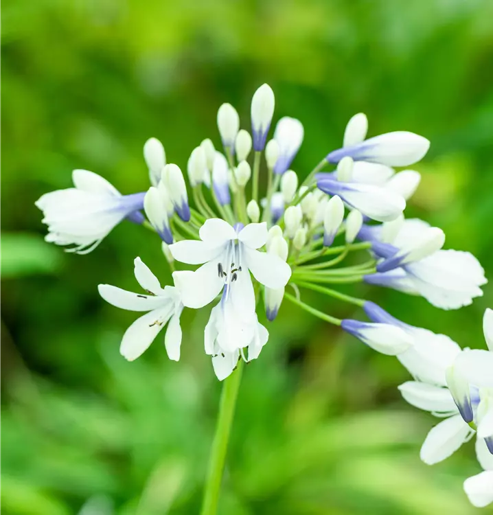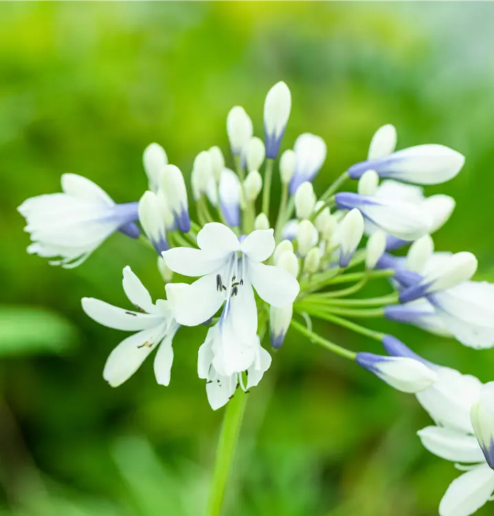 Agapanthus africanus 'Twister' bildet sternförmige, in Ähren angeordnete, blau-weiße Blüten ab Juni.