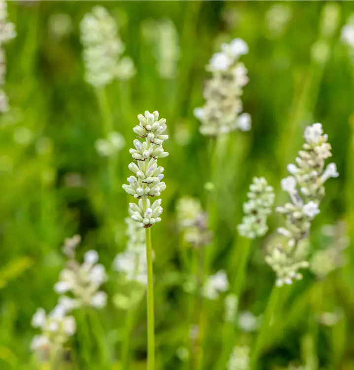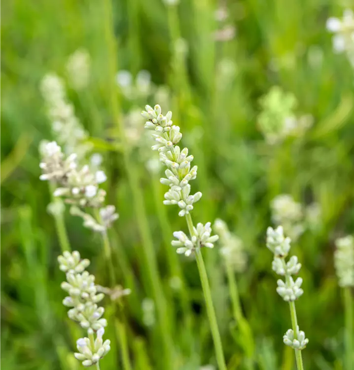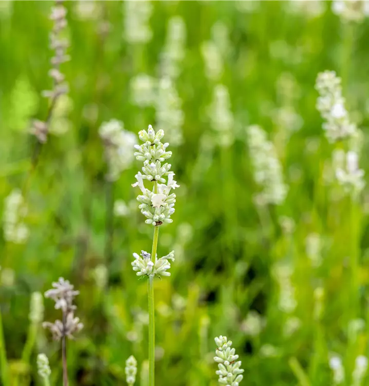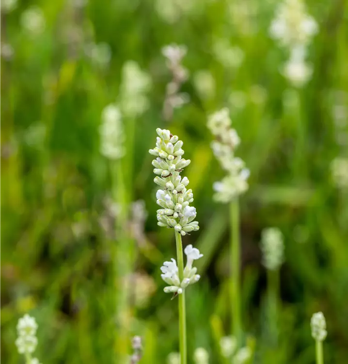 Lavandula angustifolia 'Arctic Snow' bildet rachenförmige, in Rispen angeordnete, weiße Blüten ab Juni. Diese verströmen einen angenehmen Duft.