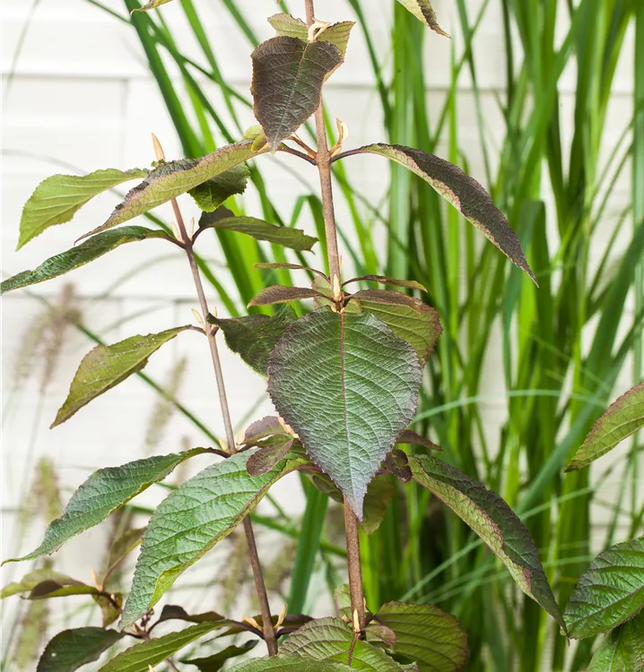 Die sommergrünen Blätter der Chinesische Schönfrucht 'Profusion' sind dunkelgrün, lanzettlich. Chinesische Schönfrucht 'Profusion' zeigt sich leuchtend gelb im Herbst.