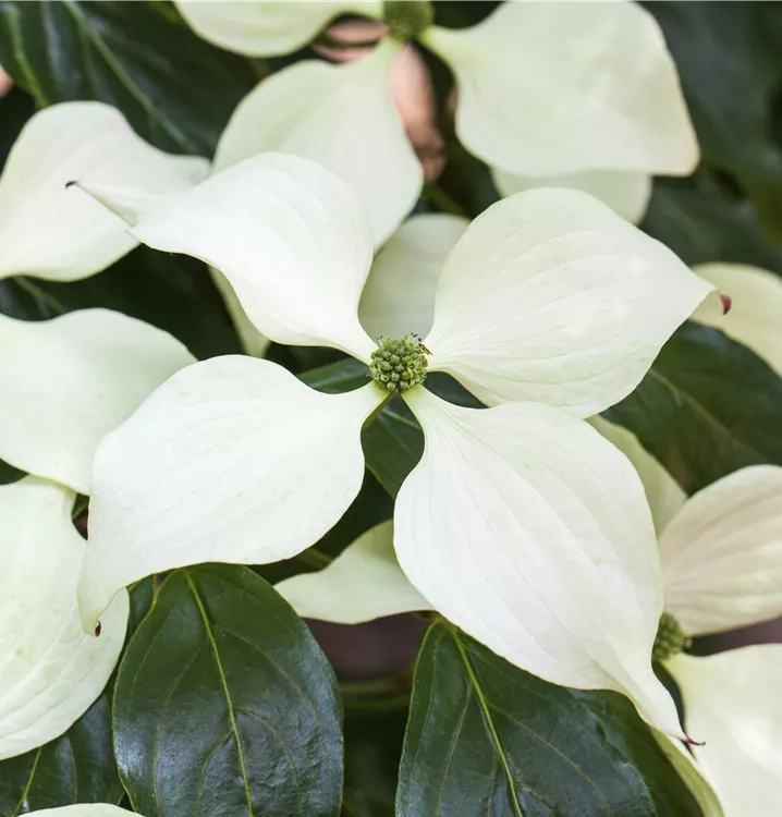 Die cremeweißen Blüten des Japanischen Blumen-Hartriegel 'Schmetterling' erscheinen in Dolden im Juni.