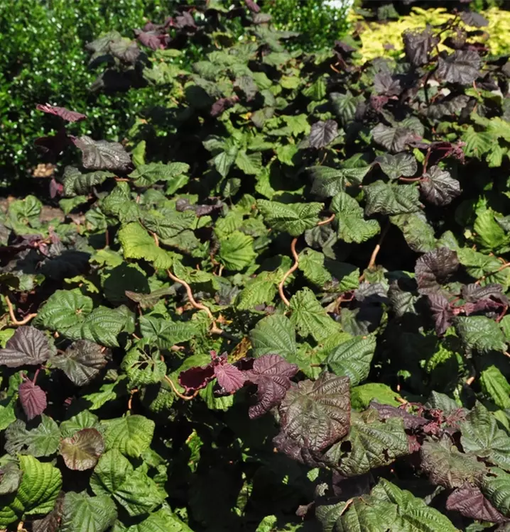 Corylus avellana 'Red Majestic' bildet rot-braune Nüsse mit einem aromatischen, nussigen Geschmack. Reifezeit ab September.