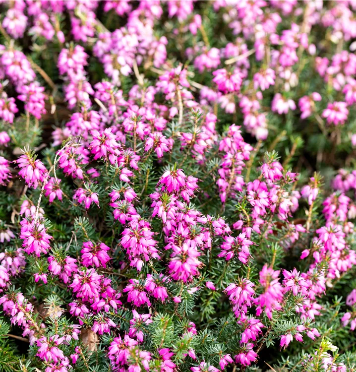 Die rosafarbenen, röhrenförmigen Blüten der Schneeheide 'Tanja' erscheinen in Trauben im Februar.