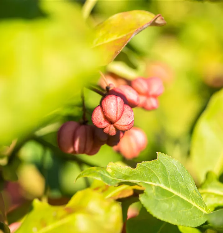 Besonders dekorativ sind die rosaroten Früchte von Euonymus europaeus. Diese erscheinen ab August.