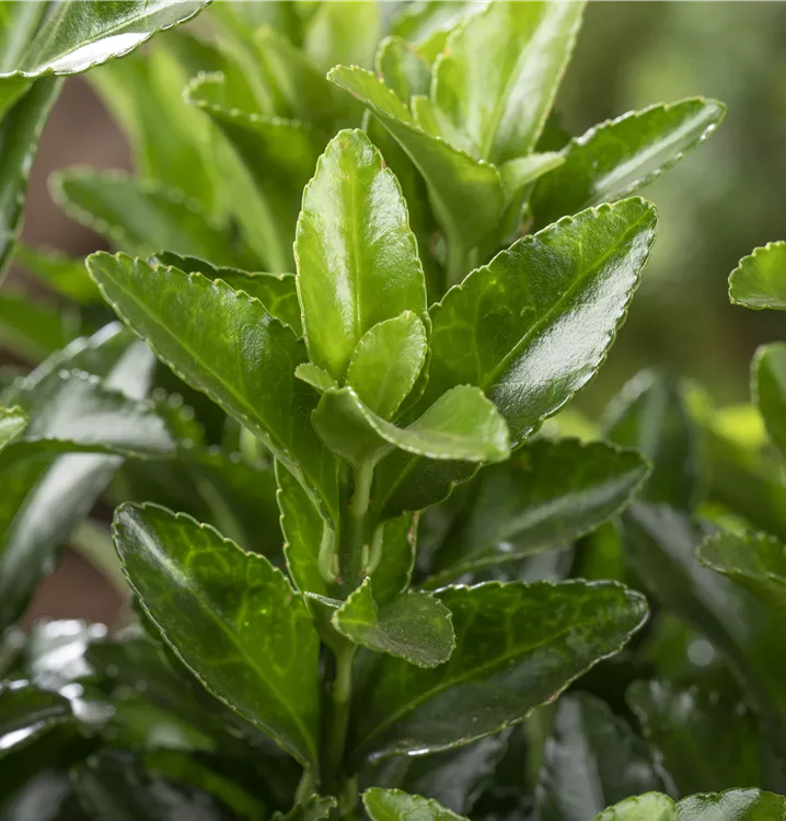 Die immergrünen Blätter der Kleinblättrige Japanspindel sind dunkelgrün und weisen einen weißen Rand auf.