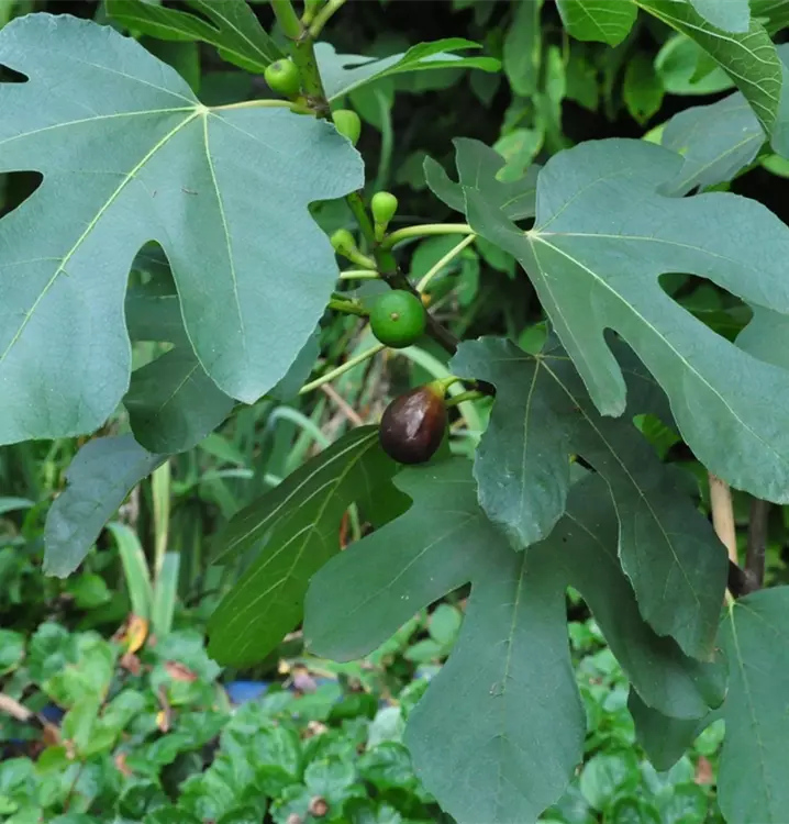 Die sommergrünen Blätter der Feige 'Ronde de Bordeaux' sind dunkelgrün, glänzend, gelappt. Feige 'Ronde de Bordeaux' zeigt sich leuchtend gelb im Herbst.