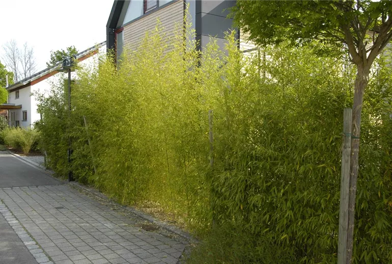 Wer nun also einen großen Garten zur Verfügung hat und eine immergrüne Hecke anlegen will, aber keine Nadelgehölze bevorzugt, der hat mit Bambus gewonnen. Denn bei der Gartengestaltung mit Bambus kann man mit dem Gras im Handumdrehen wunderschöne Hecken anlegen, die nicht nur pflegeleicht sind, sondern mit ein paar Tipps und Tricks auch noch richtig blickdicht wachsen. Wie das geht? Bambushalme wachsen nur eine Saison. Schneidet man sie ab, wachsen sie also nicht weiter. Damit kann man im mittleren Bereich durch einen gezielten Rückschnitt die gewünschte Fülle erreichen und nach oben hin neue Halme wachsen lassen. Wichtig ist ein sandig-lehmiger, humoser und nährstoffreicher Boden. Darin fühlen sich nämlich alle Bambus-Arten wohl. Gepflanzt wird am besten im Frühjahr, Topfpflanzen können aber das ganze Jahr über gepflanzt werden, wenn keine Fröste zu erwarten sind. Dann kann man sich bei der Gartengestaltung mit Bambus die schönsten Hecken anlegen, die garantiert keine neugierigen Blicke der Nachbarn zulassen und ganz nebenbei auch das ganze Jahr über ein optisches Highlight sind. Gerade, wenn andere Pflanzen ihre Blätter abwerfen, macht Bambus richtig was her, denn er sieht exotisch aus, ist hierzulande aber absolut winterhart und fühlt sich in unseren Gärten richtig wohl.