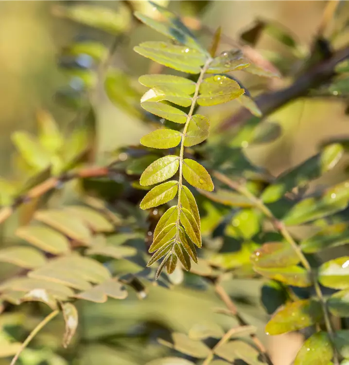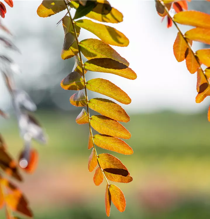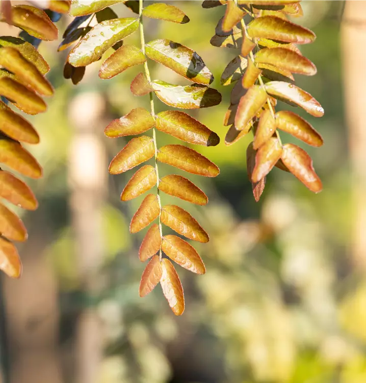 Besonders dekorativ sind die rot-braunen Früchte von Gleditsia triacanthos 'Rubylace'. Diese erscheinen ab September. Haften sehr lange.