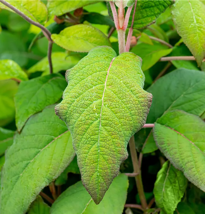 Die sommergrünen Blätter der Fellhortensie 'Macrophylla' sind dunkelgrün, lanzettlich, behaart, gegenständig. Diese sind etwa 20 - 35 cm groß.