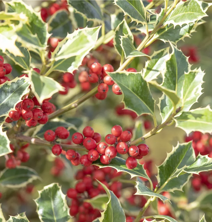 Besonders dekorativ sind die roten Steinfrüchte von Ilex aquifolium 'Argentea Marginata'. Diese erscheinen ab Oktober.Haften sehr lange.