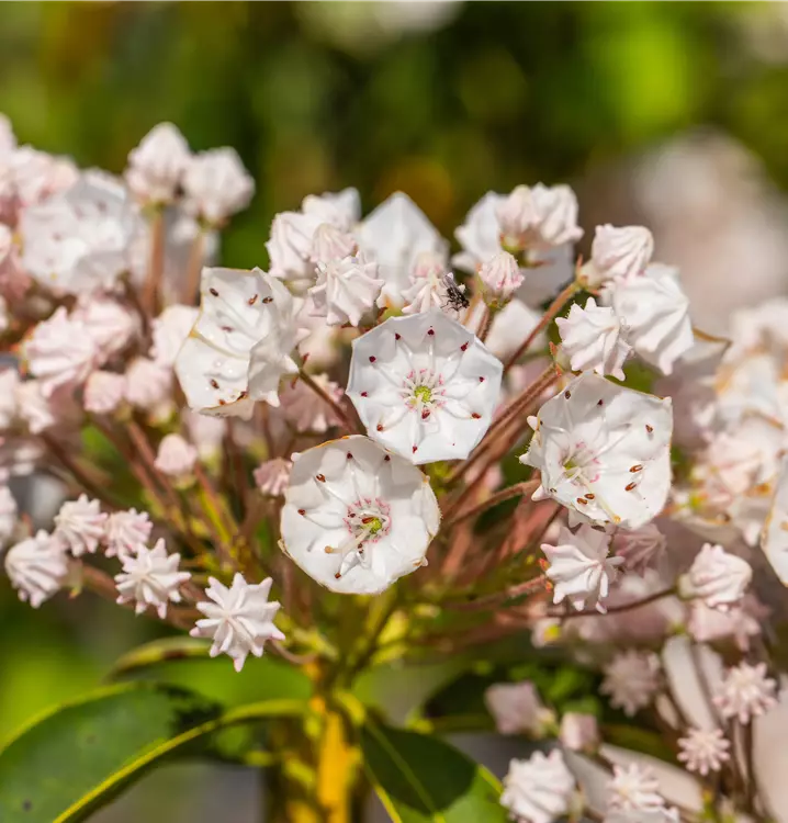 Die hellrosafarbenen, schalenförmigen Blüten des Weißblühenden Berglorbeer 'Elf' erscheinen in Doldentrauben von Mai bis Juni.