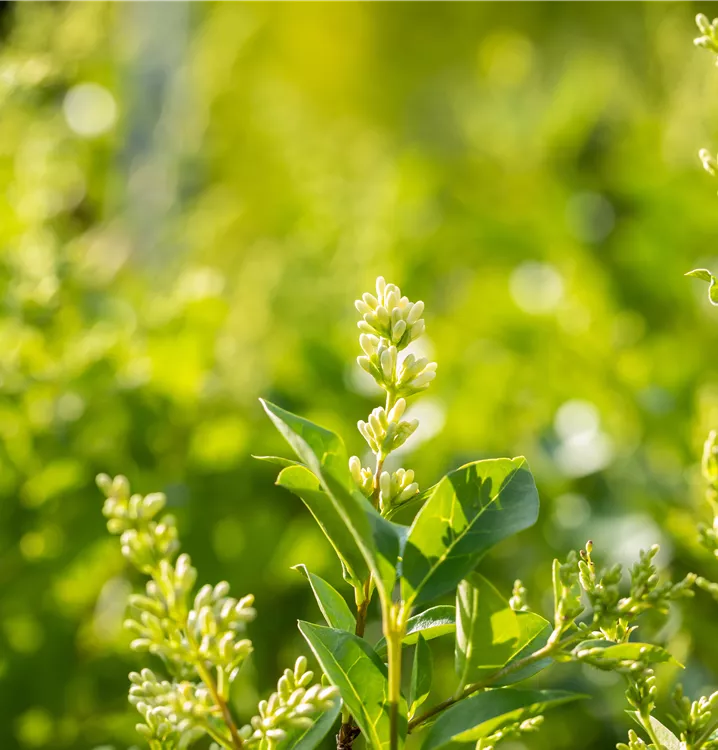 Der Ovalblättrige Liguster (Ligustrum ovalifolium) ist ein aufrechter, straffer Strauch, der cremeweiße Blüten mit einem starken Duft hervorbringt. Sie erscheinen von Juni bis Juli. Aus diesen gehen ab September schwarze, runde Früchte hervor. Sie verströmen einen starken Duft. Zudem trägt der Ovalblättrige Liguster, glänzende, eiförmige, dunkelgrüne Blätter. An einem sonnigen bis halbschattigen, windgeschützten Standort mit durchlässigem, kalkhaltigem, nährstoffreichem Boden erreicht er gewöhnlich eine Höhe von ca. 5 m und wird ca. 3 m breit.