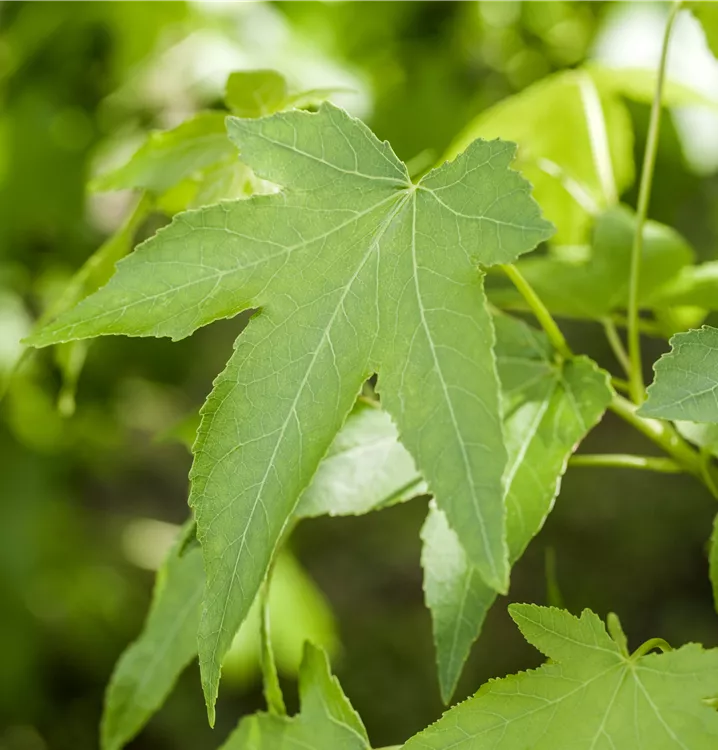 Die sommergrünen Blätter des Amberbaums 'Slender Silhouette' sind mittelgrün, gefingert, wechselständig. Diese sind etwa 12 - 15 cm groß. Amberbaum 'Slender Silhouette' zeigt sich leuchtend purpurrot bis rot-orange im Herbst.