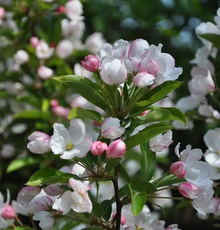 Malus 'Adirondack' bringt von April bis Mai rosafarbene, weiße Blüten hervor. Diese werden etwa 4 - 4,5 cm groß.