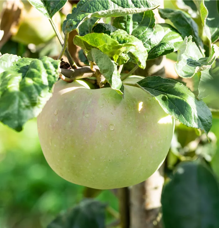 Der Apfel 'Ontario' (Malus domestica) bildet gelb-grüne, mittelgroße, weiche und saftige Früchte. Sie sind flach und haben einen säuerlichen Geschmack. Für eine ertragreiche Ernte ab Mitte Oktober schaffen durchlässiger, nährstoffreicher Boden und ein sonniger bis halbschattiger Standort optimale Bedingungen. Seine hellrosafarbenen Blüten sind eine schöne Erscheinung. Der Apfel 'Ontario' wird mit seinem aufrechten und breiten Wuchs etwa 4 m hoch und 3 m breit.