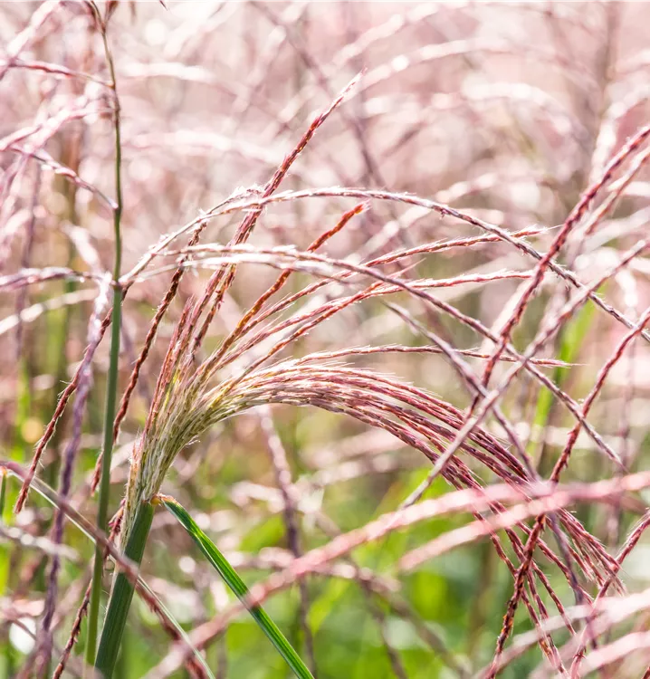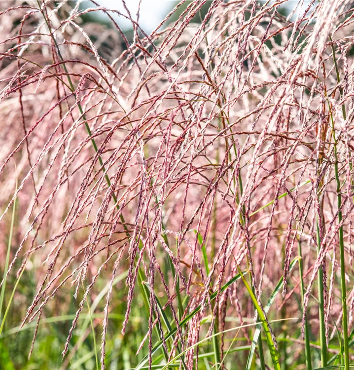 Die rosafarbenen Blüten des Garten-Chinaschilf 'Flamingo' erscheinen in Rispen von August bis September.