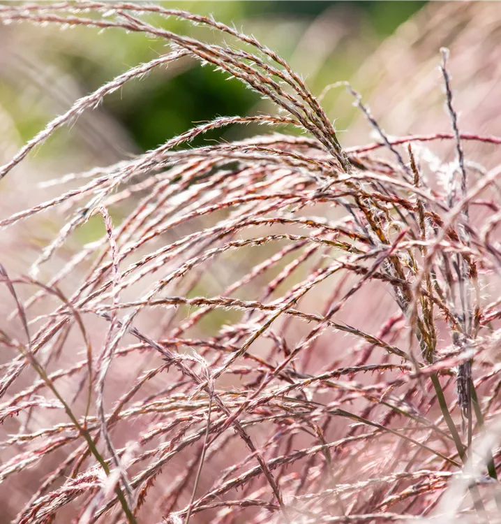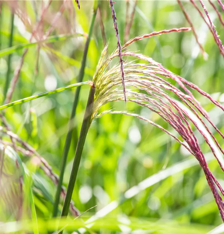 Das Garten-Chinaschilf 'Flamingo' (Miscanthus sinensis) ist mit seiner mittelgrünen Blattfärbung ein dekoratives Gestaltungselement im Garten, welches ebenso mit seinem aufrechten und horstbildenden Wuchs hervorsticht. Die rosafarbenen Blütenrispen schmücken diese Gras ab Sommer. An einem sonnigen bis halbschattigen Standort mit einem möglichst durchlässigen, humosen, nährstoffreichen Boden fühlt es sich am wohlsten. Bei günstigen Bedingungen erreicht dieses winterharte Gras eine Höhe von ca. 1,2 m und wird bis zu 90 cm breit.