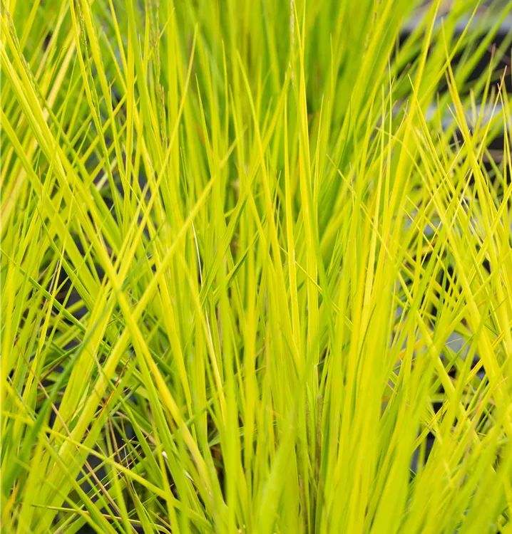 Die sommergrünen Blätter des Kleinen Pfeifengrases 'Heidebraut' sind mittelgrün, lineal. Kleines Pfeifengras 'Heidebraut' zeigt sich leuchtend gelb im Herbst.