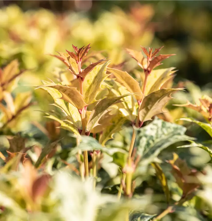 Die Duftblüte 'Goshiki' (Osmanthus heterophyllus) ist ein aufrechter, rundlicher, kompakter Kleinstrauch, der weiße Blüten mit einem angenehmen Duft hervorbringt. Sie erscheinen von August bis Oktober. Aus diesen gehen schwarze, ovale Früchte hervor. Sie verströmen einen angenehmen Duft. Zudem trägt die Duftblüte 'Goshiki', glänzende, eiförmige, dunkelgrüne, panaschiert gezeichnete Blätter. Der rote Austrieb ist ebenso ein interessanter Anblick. An einem halbschattigen bis schattigen, windgeschützten Standort mit durchlässigem, humosem Boden erreicht sie gewöhnlich eine Höhe von ca. 1,5 m und wird ca. 1,5 m breit.