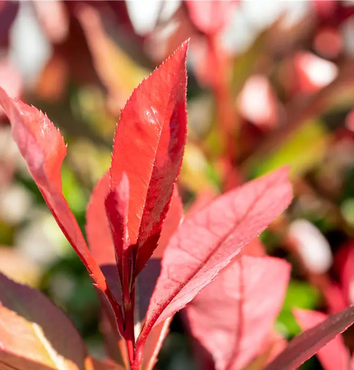 Die immergrünen Blätter der Glanzmispel 'Devils Dream'® sind dunkelgrün, lanzettlich, gesägt. Diese sind etwa 8 - 12 cm groß. Leuchtend roter Austrieb.