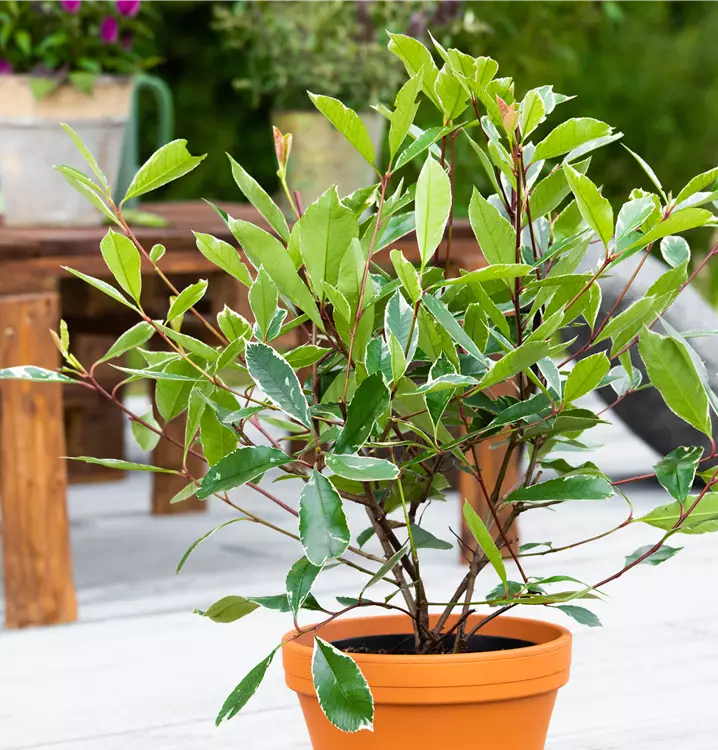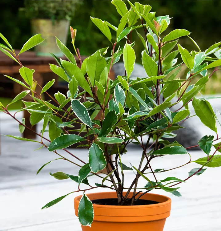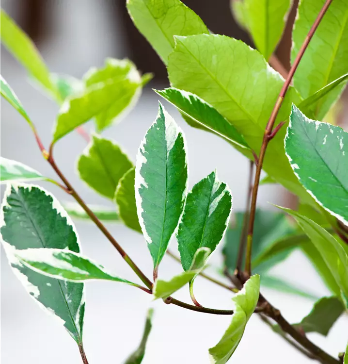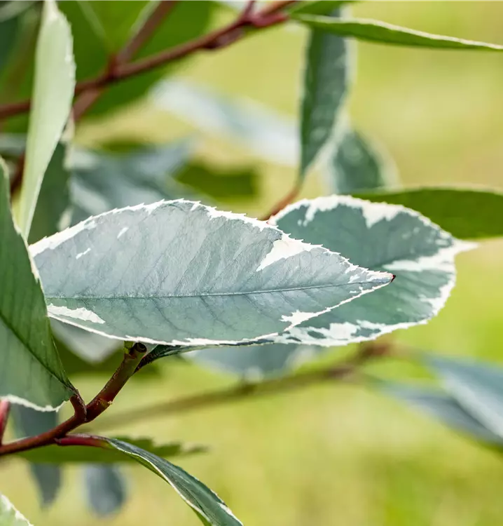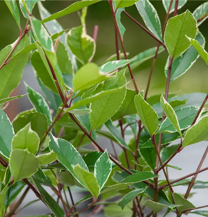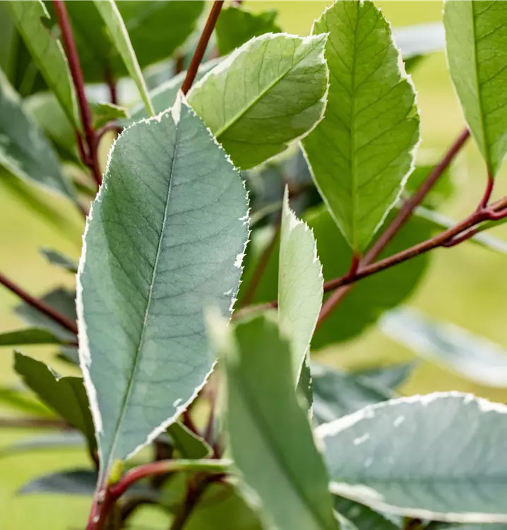 Hoher Blattschmuckwert. Die immergrünen Blätter der Glanzmispel 'Louise'(s) sind dunkelgrün, lanzettlich, glänzend und weisen einen weißen Rand auf. Rosa-roter Austrieb.