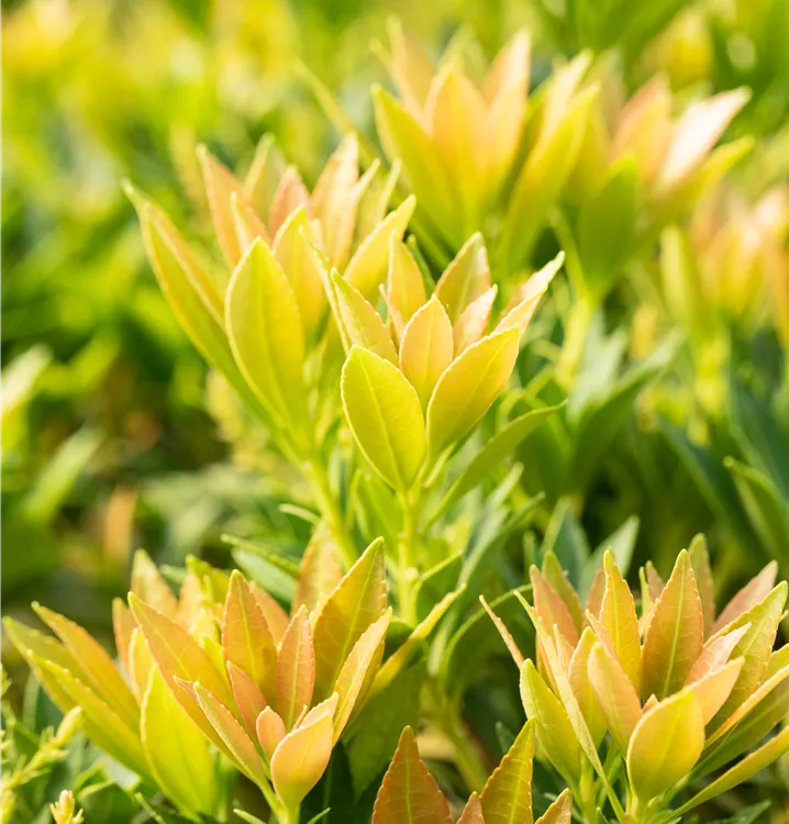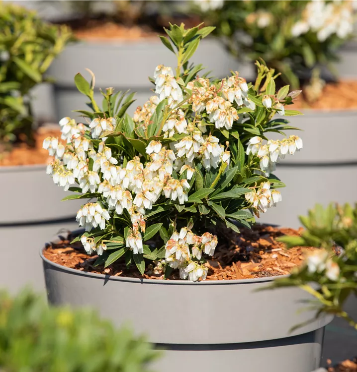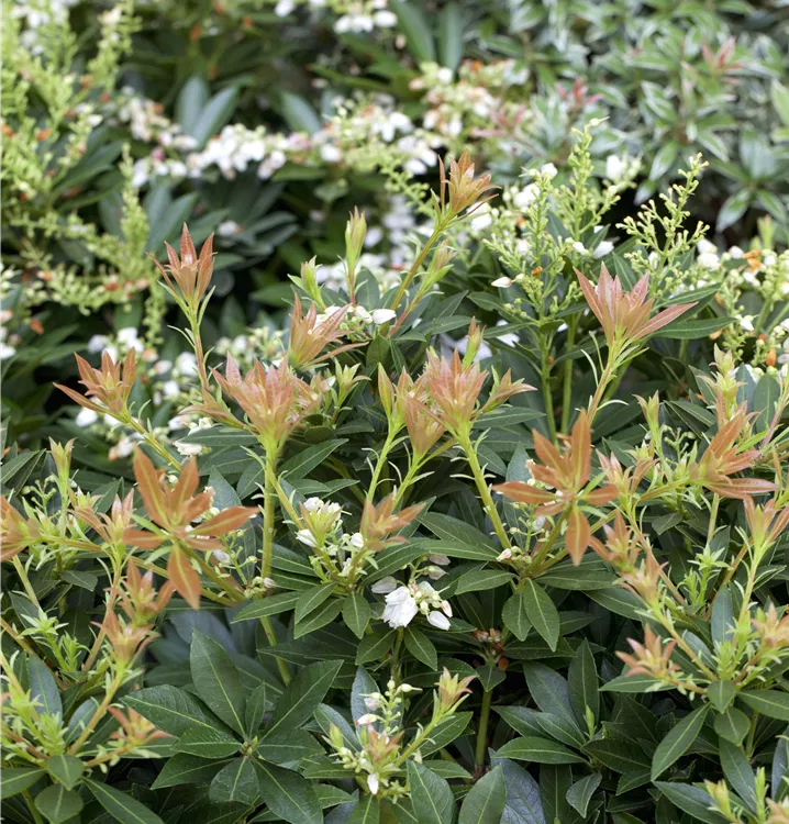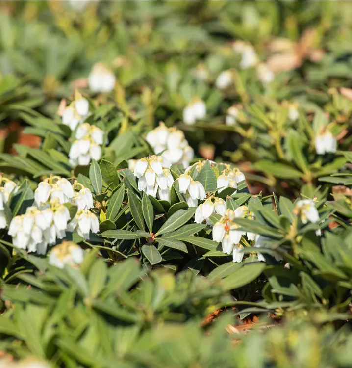 Das Schattenglöckchen 'Prelude' (Pieris japonica) ist ein buschiger, breiter, kompakter Kleinstrauch, der weiße, in Rispen angeordnete Blüten hervorbringt. Sie erscheinen von April bis Mai. Aus diesen gehen ab August hellbraune, runde Früchte hervor. Zudem trägt das Schattenglöckchen 'Prelude', glänzende, lanzettliche, dunkelgrüne Blätter. Der kupferbraune Austrieb ist ebenso ein interessanter Anblick. Seine Rinde ist rot-braun, streifenförmig eingerissen. An einem halbschattigen bis schattigen, windgeschützten Standort mit humosem, nährstoffreichem Boden erreicht es gewöhnlich eine Höhe von ca. 1,5 m und wird ca. 1,8 m breit.