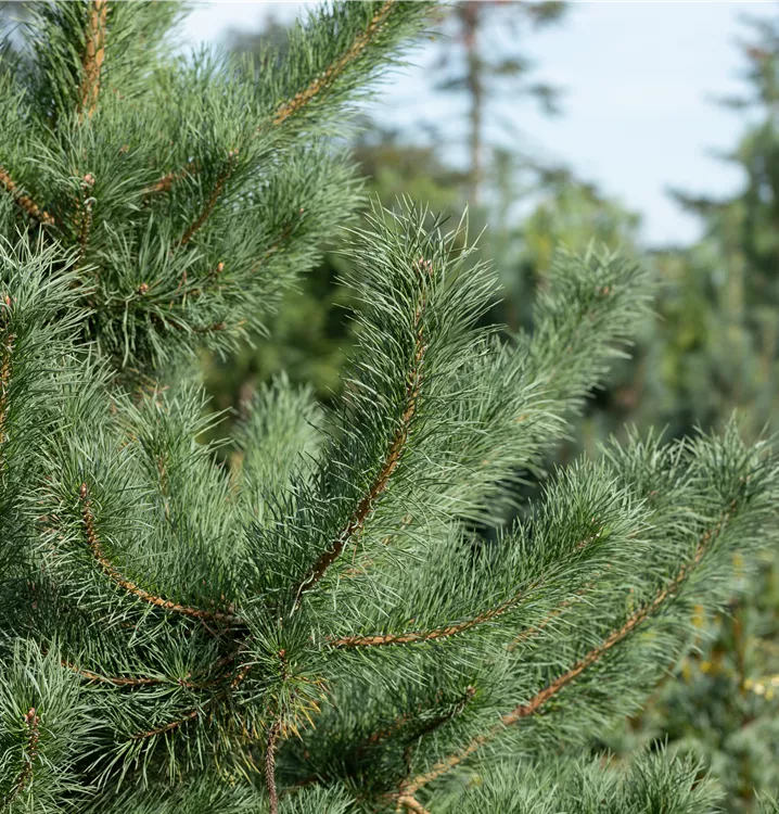 Blaue Zirbelkiefer 'Compacta' ist ein pyramidal wachsender, malerischer Baum mit lockerer Krone. Sie erreicht gewöhnlich eine Höhe von 3,5 - 6 m und wird ca. 3 - 4 m breit. Langsam wachsend. In der Regel wächst sie 15 - 25 cm pro Jahr.