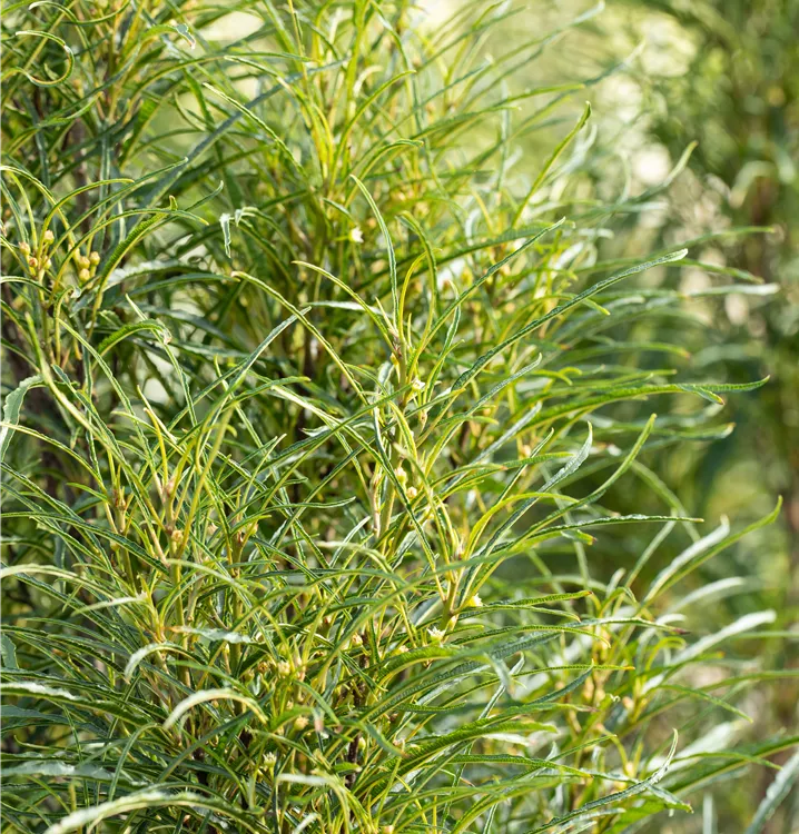 Hoher Blattschmuckwert. Die sommergrünen Blätter des Farnblättrigen Faulbaums 'Fine Line'® sind mittelgrün, lanzettlich, glänzend, wechselständig. Diese sind etwa 10 - 15 cm groß. Farnblättriger Faulbaum 'Fine Line'® zeigt sich leuchtend goldgelb im Herbst.