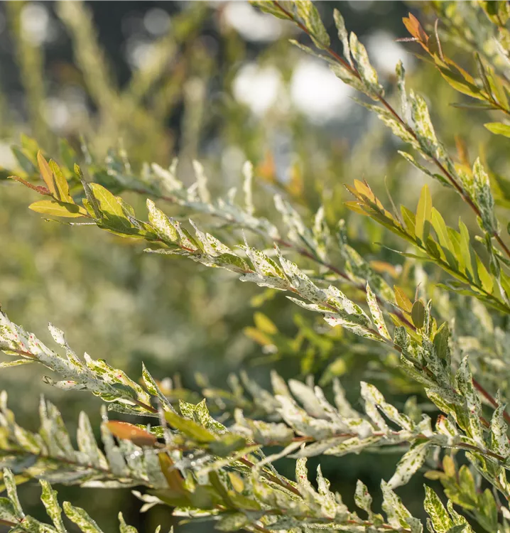 Zudem trägt die Harlekin-Weide 'Hakuro Nishiki', lanzettliche, grün-weiße Blätter. Der weiß-rosafarbene Austrieb ist ebenso ein interessanter Anblick. An einem sonnigen bis halbschattigen Standort erreicht sie gewöhnlich eine Höhe von ca. 3 m und wird ca. 3 m breit. An den Boden stellt die Harlekin-Weide 'Hakuro Nishiki' keine besonderen Ansprüche.