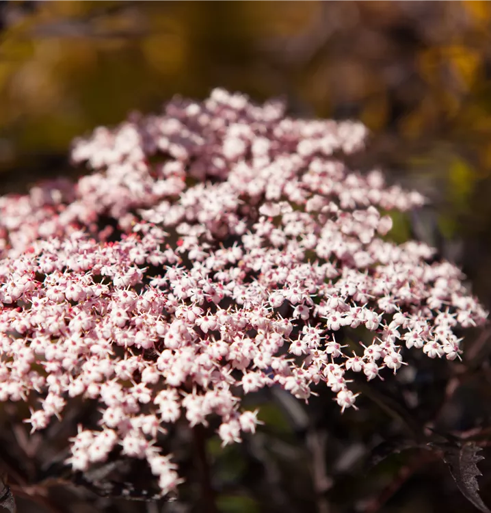 Die rosafarbenen Blüten des Schwarzen Holunder 'Black Lace'(s) erscheinen in Schirmtrauben von Juni bis Juli. Diese sind leicht duftend.