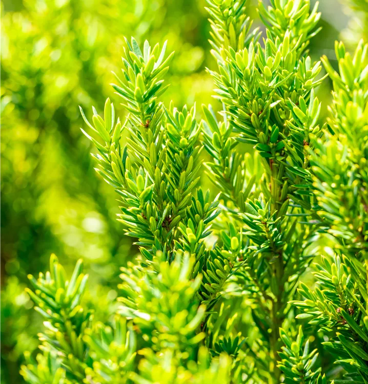 Die Kegel-Eibe 'Overeynderi' ist immergrün. Ihre Nadeln sind dunkelgrün.