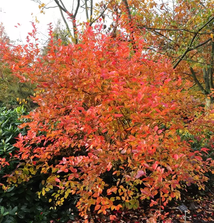 Die sommergrünen Blätter der Heidelbeere 'Goldtraube' sind mittelgrün, lanzettlich, wechselständig. Heidelbeere 'Goldtraube' zeigt sich leuchtend orange-rot bis gelb im Herbst.