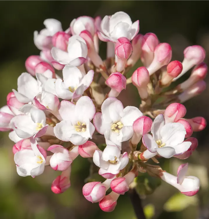Die hellrosafarbenen Blüten des Duftschneeball 'December Dwarf' erscheinen in Rispen von November bis März. Diese sind stark duftend.