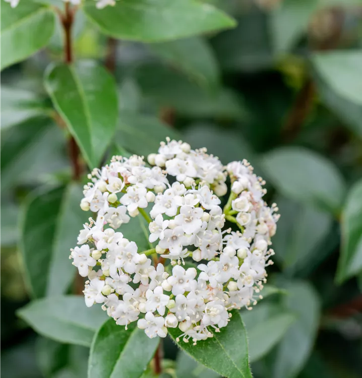 Der Lorbeer-Schneeball 'Eve Price' (Viburnum tinus) ist ein aufrechter, breiter, buschiger Strauch mit dekorativen, blau-grauen, ovalen Früchten. Diese verströmen einen leichten Duft. Diesen voraus bringt er von Februar bis April hellrosa-weiße, in Schirmtrauben angeordnete Blüten hervor. Bei richtiger Pflege blüht der Lorbeer-Schneeball 'Eve Price' erneut im November. Zudem trägt der Lorbeer-Schneeball 'Eve Price', glänzende, lanzettliche, dunkelgrüne Blätter. An einem sonnigen bis halbschattigen, windgeschützten Standort mit durchlässigem, humosem Boden erreicht er gewöhnlich eine Höhe von ca. 4 m und wird ca. 4 m breit.