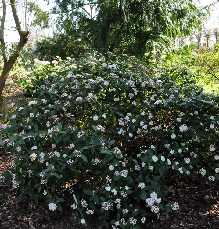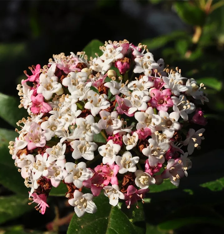 Die hellrosa-weißen Blüten des Lorbeer-Schneeball 'Eve Price' erscheinen in Schirmtrauben von Februar bis April. Diese sind leicht duftend. Bei richtiger Pflege Nachblüte im November.